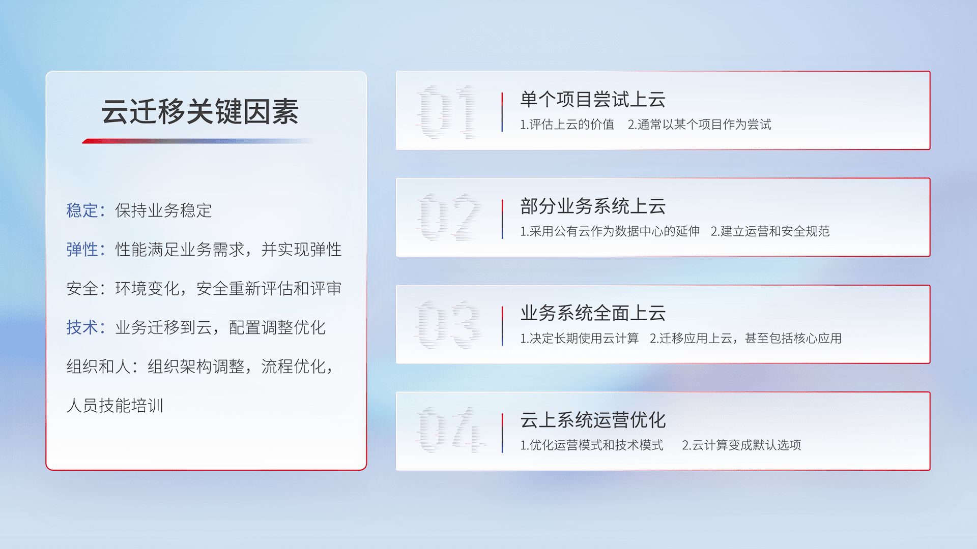结合实际业务,,从规划设计、、、、云平台选型、、、、云原生改造、、、数据迁移、、、、集成交付,,迁移全过程为客户识别最佳上云路径,,做好风险识别管理,,,设计网络架构、、身份权限、、、、安全审计合规、、操作审计、、、日志审计、、、、监控告警策略、、多站点容灾设计等,,,对云上基础设施进行整体规划,,,提升IT治理水平,,以满足弹性、、高可用、、高性能的需求。。