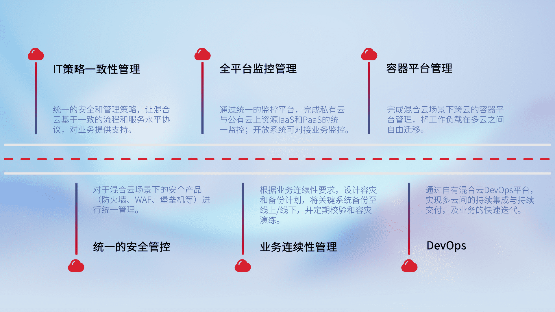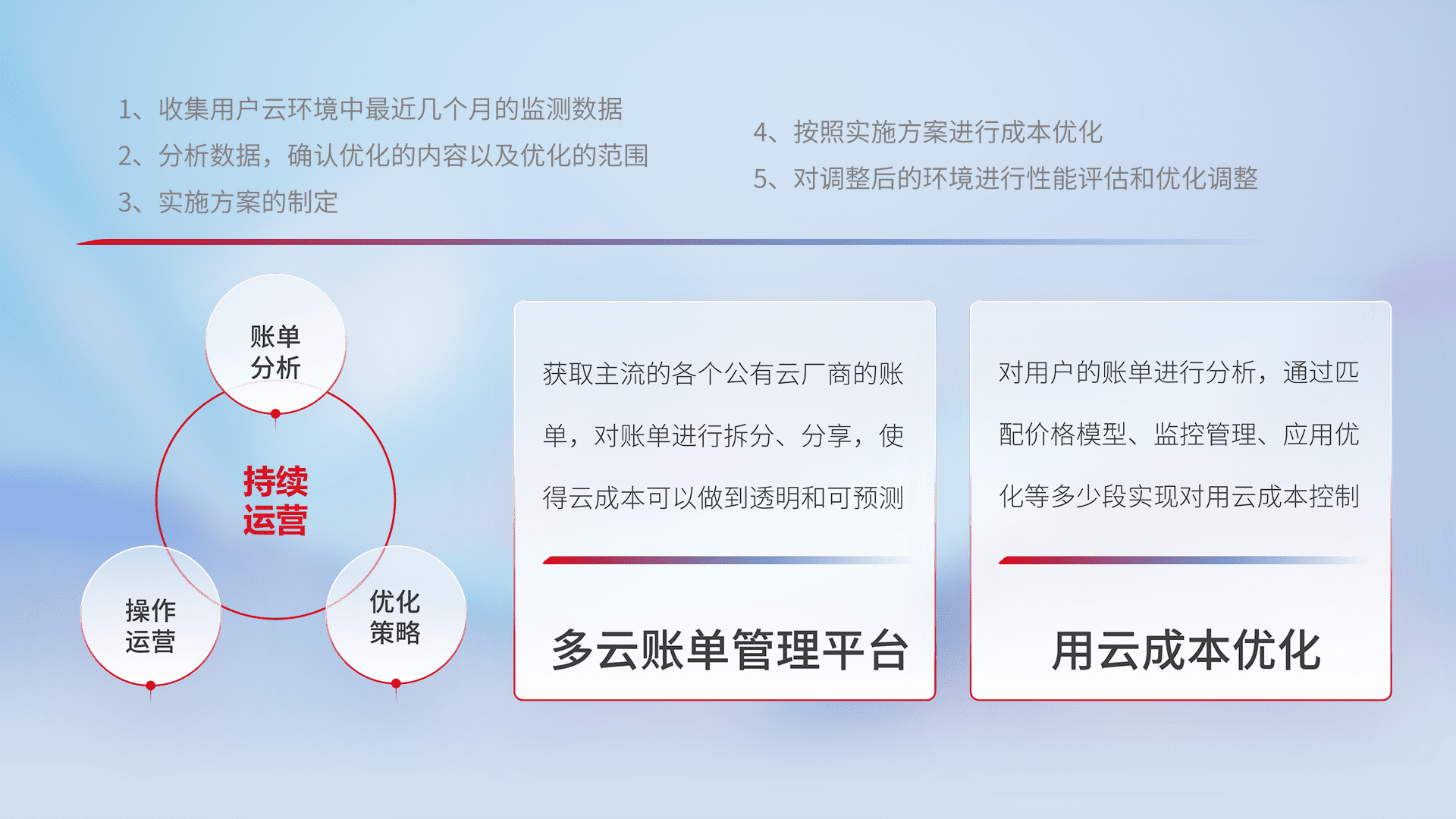 通过多云纳管,,,,以统一的资源数据模型把客户的云资源进行抽象和封装,,,进而实现对多云资源的统一操作,,,,保障云资源管理的可靠性、、、稳定性与可用性。。。量身定制化运维内容,,配置、、、开发运维、、、补丁管理、、、备份、、、、监控、、、认证和访问管理、、审计和日常巡检等,,保障在用云过程中的可靠度,,稳定度以及高可用率。。。。