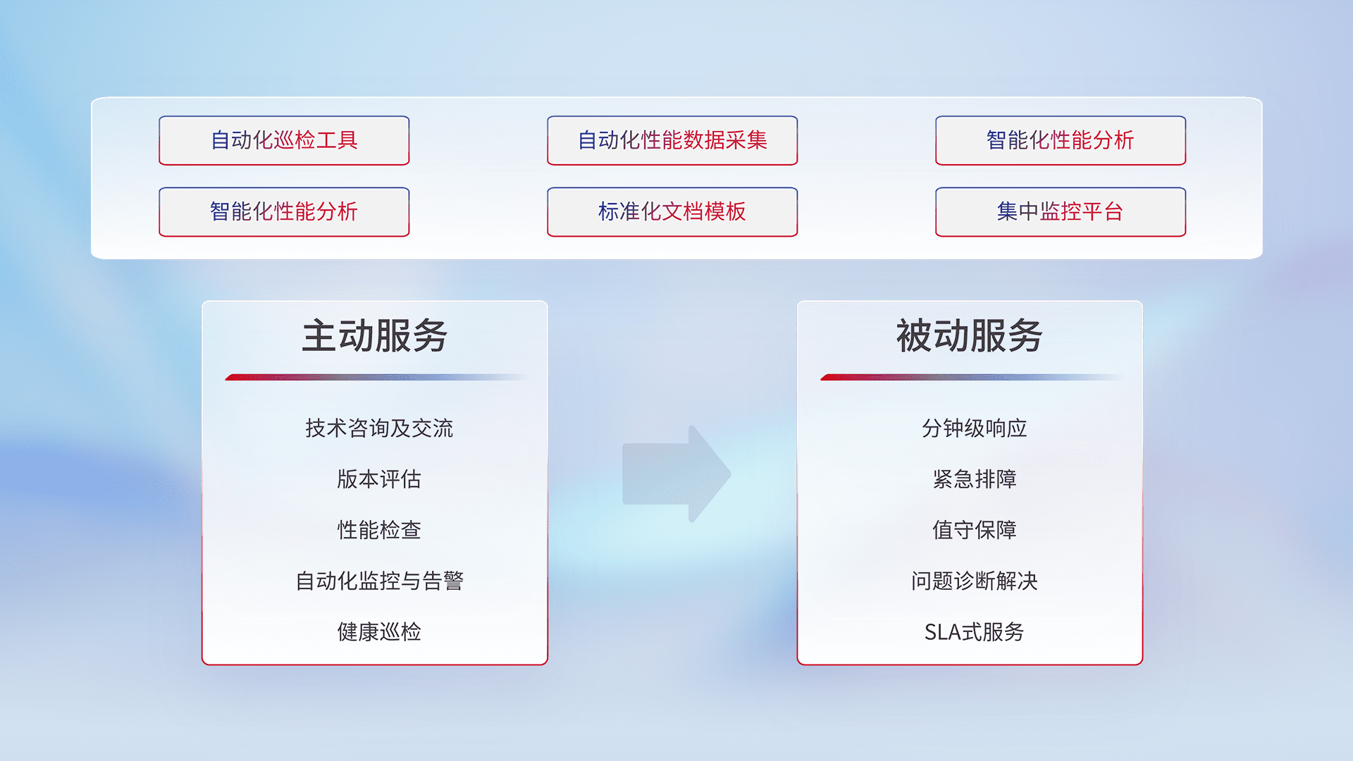 智能化工具和标准化文档,,保障服务质量,,提供主动服务(包含技术咨询、、版本评估、、性能检查、、自动化监控与告警、、、健康巡检)和被动服务包含(分钟级响应、、紧急排障、、、、值守保障、、、、问题诊断解决、、、SLA服务)。。。。